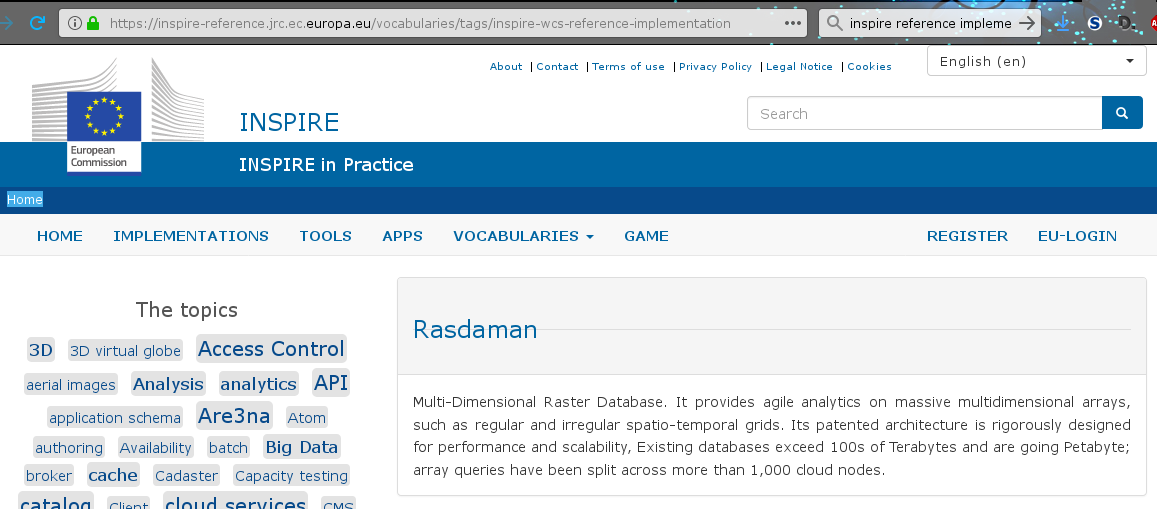 Spatio-temporal coverages appear in many, if not most themes of EU INSPIRE Annexes II and III. In 2016, INSPIRE has adopted OGC WCS as Coverage Download Service, rasdaman has been decided to become an official INSPIRE WCS Reference Implementation (cf. https://inspire-reference.jrc.ec.europa.eu/vocabularies/tags/inspire-wcs-reference-implementation and Figure 1).